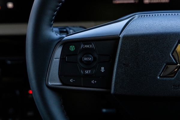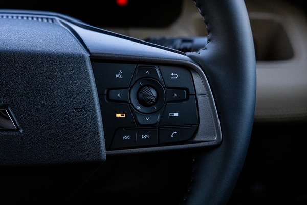 ステアリングホイールを見て最初に驚くのは、リモコンの位置。クルーズコントロール系とオーディオ操作系が国産車と逆なのです。「これ、どうしたんですか? 輸出するんですか?」と尋ねると、どうやら兄弟車を作る日産側が決めたのだそう。