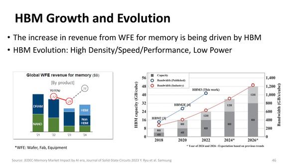 HBMといってもDRAMには違いないわけで、セルの構造の進化そのものはDRAMと違いはない。異なるのはパッケージ技術のみである。そのHBM、AIブームのおかげで猛烈な売り上げが立ち、かつどんどん高速化しているというのはご存知のとおり。