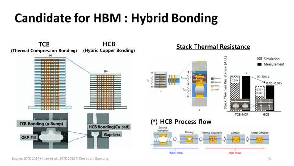 実際高さが減じられたうえ、画像右にあるように熱抵抗も15~30%削減できるとしている。欠点としては、ダイを削る(右下のHCB Process flowで言えばDishingの部分)際に従来より極めて平滑度を上げる必要性がある。おそらくHybrid Bondingに対応できる新しい研磨装置と研磨材料が必要になるので、そこにコストがかかることと、その後にHybrid Bondingならではの工程が入ることだろう。