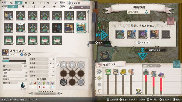 すでに定着しているモンスターを里孵しすると「生態ランク」が上がり、より強力な個体になる(最高Sランク)。さらに特定の条件を満たすと「突然変異」を起こし、別種が生まれることも。