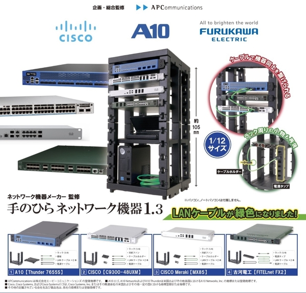 手のひらネットワーク機器は、メーカー監修のもと、ITインフラ機器を1/12サイズのミニチュアとして再現したカプセルトイシリーズ。機器本体に加え、付属するサーバーラックやLANケーブル、冷却ファンといった小物までを忠実に作り込んでおり、自宅や職場でデータセンターを構築する気分が味わえる。過去のシリーズ同様、SIer事業などを手掛けるエーピーコミュニケーションズが企画・総合監修を担当する。