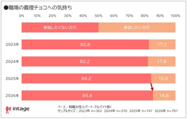 [生活][消費] 価格高騰直撃のバレンタインデー、職場の義理チョコは85%が「参加したくない」(インテージ、1月30日)