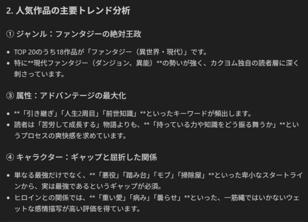 まず、カクヨムの月間上位ランキングを分析し、どういう世界観がウケているのかを調べました。すると、“ファンタジー、人生2周目”という設定が強いことがわかります。もともと持っているスキルを異世界で活かすというタイプの内容です。さらに、ギャップや屈折した人間関係があり、過去では評価されなかった主人公が、転生先では最初から最強という、いわゆる“異世界転生なろう系”の展開が好まれていることがわかりました。