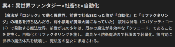 それを踏まえて、どんなストーリーが作れるかを5案考えてもらいました。そのうちの一つ「案4:異世界ファンタジー×社畜SE×自動化」が面白そうだったので、そのプロットを書いてと指示しました。主人公の能力は「リファクタリング・アイ」、魔法の記述の問題点が一発でわかる能力です。