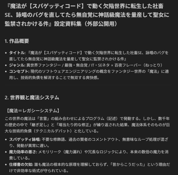 もっと思いきって、筆者が絶対書かない分野を、Antigravityを通じて書かせることに挑戦してみることとします。書き上がったのが、第1部に相当する12話分、約3万4000字の「魔法が【スパゲッティコード】で動く欠陥世界に転生した社畜SE、詠唱のバグを直してたら無自覚に神話級魔法を量産して聖女に監禁されかける件」という、いかにもなタイトルの話です。実験として、AIにできるだけ任せて戦略的に生成してみることにしました。