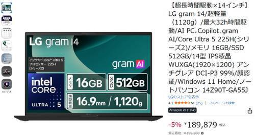 LGの14インチノートPC「LG gram 14」が、Amazonでセール対象になっています。過去価格199,800円のところ、5%オフの189,879円で販売中です。