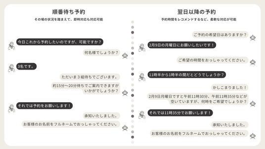 焼肉きんぐ特有の「順番待ち」「翌日以降の予約」といった複雑な予約体系に対しても、生成AIを活用した対話により、自然な対話を実現しています。