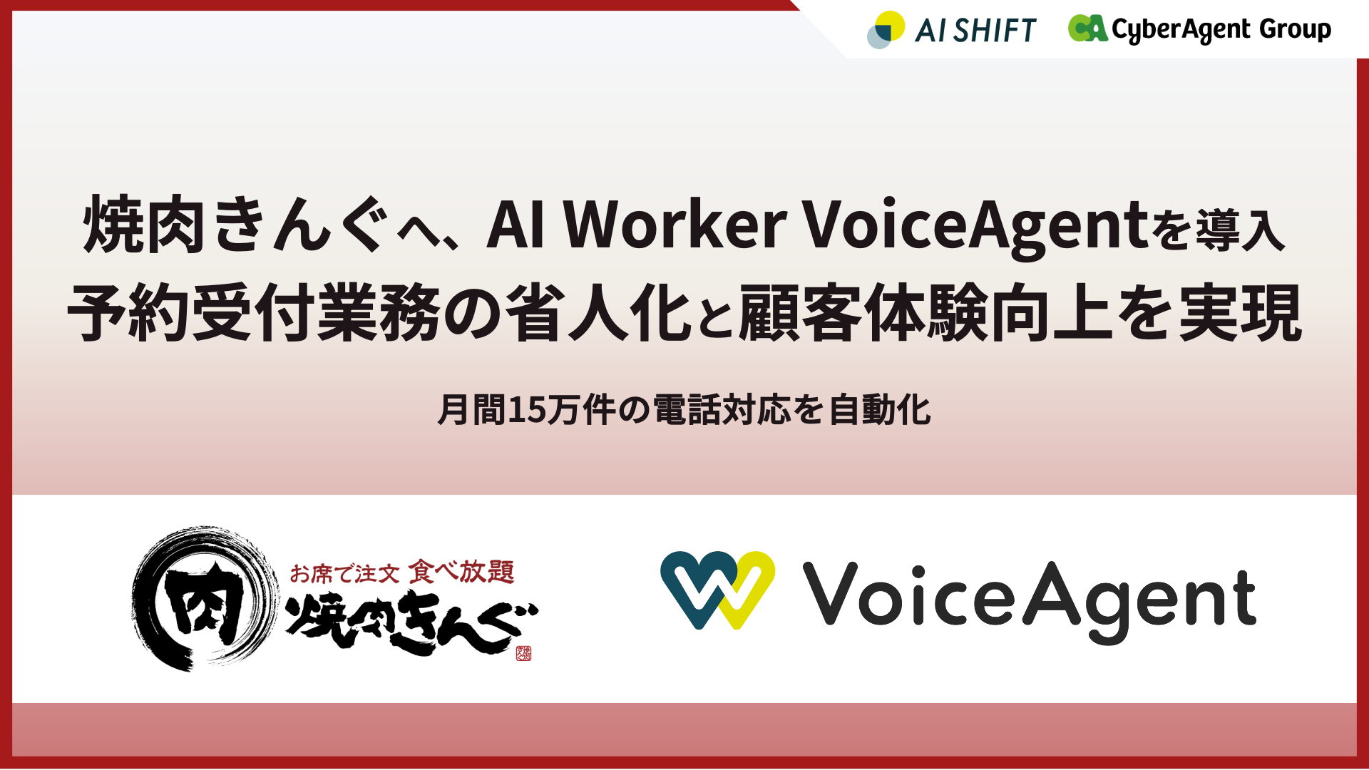 株式会社AI Shift(本社:東京都渋谷区、代表取締役社長:米山 結人)は、電話対応を担うAIエージェント「AI Worker VoiceAgent」が、予約を中心とした電話対応業務の自動化に向けて、株式会社物語コーポレーション(本社:愛知県豊橋市、代表取締役社長:加藤 央之)が運営する焼肉食べ放題専門店「焼肉きんぐ」に導入されたことをお知らせします。本導入により、月間約15万件にのぼる電話対応の自動化を実現し、店舗運営の効率化および顧客体験の向上に貢献しています。