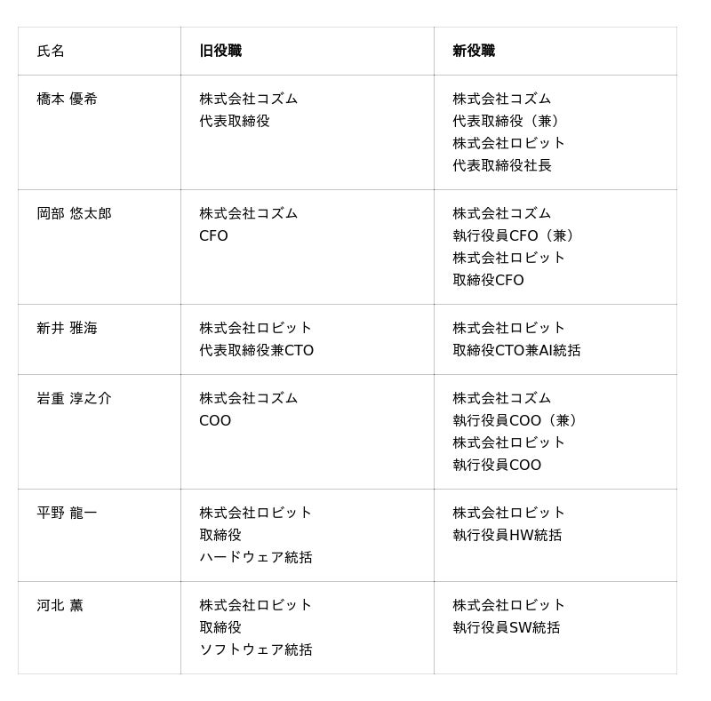 全体の技術戦略を強化するため、ロビット旧代表の新井氏がCTOとして参画するほか、両社の実務責任者が一堂に会する布陣となります。