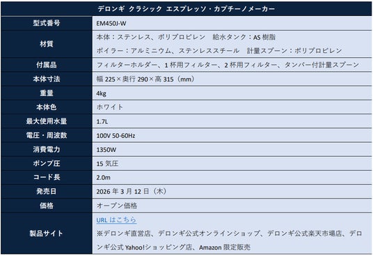 デロンギ・ジャパン株式会社(本社:東京都港区、代表取締役社長:甲斐 ラース)は、ご自宅で本格的なバリスタ体験を叶えられる「クラシック エスプレッソ・カプチーノメーカー」(以下、クラシック)の新色「ホワイト(EM450J-W)」を2026年3月12日(木)よりデロンギ直営店、デロンギ公式オンラインショップ、デロンギ公式楽天市場店、デロンギ公式Yahoo!ショッピング店、Amazonにて新発売いたします。