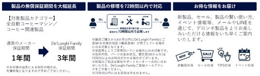 デロンギ製品をご購入いただいたお客様に、安心して製品を長くご愛用いただくため、ご購入後のメーカー無償保証期間の延長、万が一の際の迅速な修理対応といったアフターケアを大幅に拡大し提供いたします。また、メンバー限定の先行情報として、新商品やセールなどの最新情報もいち早くお届けいたします。