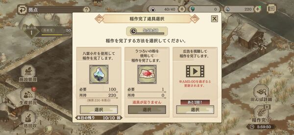 稲作の時短方法はいくつか用意されている。そのなかの広告視聴を選択(1日1回)