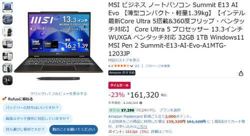 MSIの13.3型ビジネス向け2-in-1「Summit E13 AI Evo」が、Amazonのタイムセール対象になっています。参考価格208,909円のところ、23%オフの161,320円で販売中です。