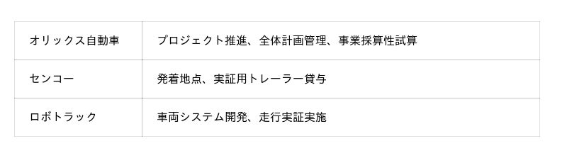 本協議会では、ロボトラックが自動運転セミトレーラーの技術開発を担い、オリックス自動車は多様な自動車関連事業で培ったサービス開発の知見を生かした事業検討を行い、センコーは実物流フィールドの提供を通じて、3社がそれぞれの強みを生かしながら、自動運転セミトレーラーの社会実装を目指した公道実証走行に取り組みます。