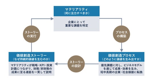 企業はパーパス(Vision/Mission/Value)に基づきマテリアリティを特定・評価し、「価値創造分野=注力テーマ」を定め、実行可能な価値創造ストーリーを設計する必要があります。これを戦略・中期経営計画に落とし込み、新たな成長を生み出す事業変革や価値創出を推進します。さらに、外部経営環境やステークホルダーからの要請を踏まえ、マテリアリティと戦略を継続的に見直し、価値創造ストーリーを実践することで、企業価値の持続的向上を実現します(図1)。