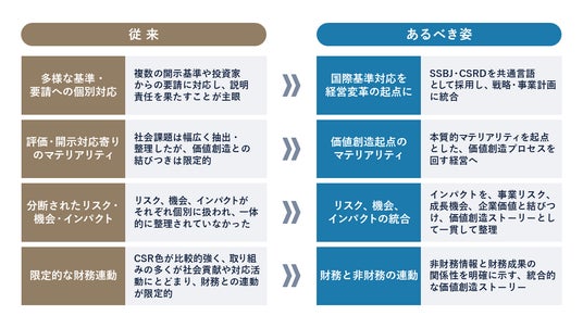 Ridgelinez株式会社(本社:東京都千代田区、代表取締役社長CEO:森光 威文、以下Ridgelinez)は、SSBJ/CSRDへの対応を契機に、単なる情報開示にとどまらず価値創造経営の実現を目指す企業に向けて、「戦略統合マテリアリティ評価からマネジメント態勢構築」までを一貫して支援するサービスの提供を開始しました。