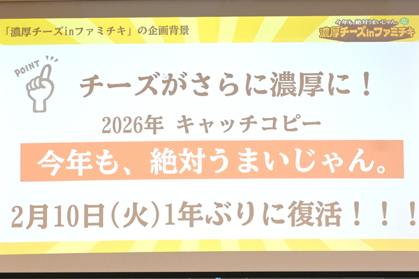 発表会では、昨年の販売実績や復活の背景についても説明がありました。「濃厚チーズinファミチキ」は、発売初週の売上で過去9年分の記録を更新し、ファミチキ史上でも突出したヒット商品となったことが改めて紹介されました。