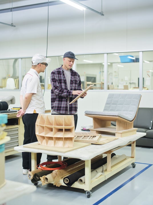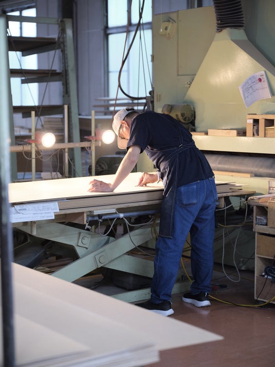 KARIMOKU RESEARCHが発表する4回目の『Survey』では、Devon Turnbullをリサーチャーに迎え、「機能とは何か?それは私たちをどう感じさせるのか?」という問いのもと、2025年より着手した共同プロジェクトの成果を発表します。Devon氏は当社の工場を訪れ、3次元加工による複雑な曲面の実現や、天然素材の個体差を活かしつつ調和を生む突板技術に触れる中で、自身の音響哲学と日本の木工技術の深い親和性を見出しました。これまで合板を主材としてきた〈OJAS〉のスピーカーに、当社の精緻な技術が加わることで、新たな音響表現と工芸的品質が結実しました。