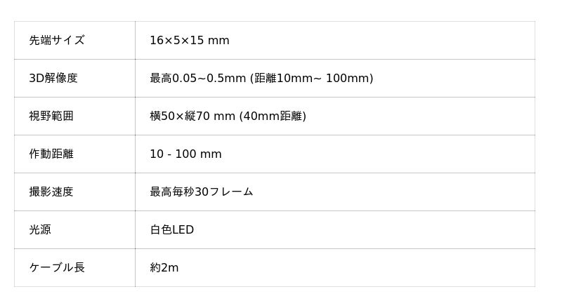 ・作動距離10~100mmで 最高で0.05~0.5mm精度の3D計測
