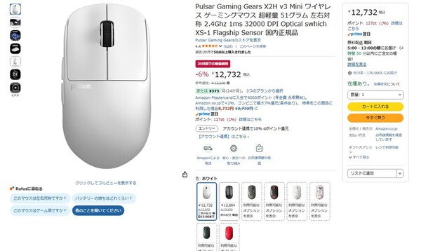 Amazon.co.jpにて、Pulsar Gaming Gearsのワイヤレスゲーミングマウス「X2H v3 Mini」が販売中だ。参考価格は1万3600円だが、執筆時点では6%オフの1万2732円で購入できる(2月9日時点)。