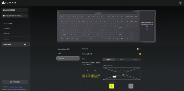 また、個人的にとくに魅力に感じたのが「FRASHTAP」という機能です。これは、いわゆる SOCD(Simultaneous Opposite Cardinal Directions)制御 の一種で、ソフトウェア上で左右・前後などの反対入力が同時に入ったときに、どちらのキー入力を優先するかを決められる機能となっています。