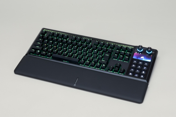 キーボード本体は、トッププレートにアルミニウムフレームが採用してあり、キーの上部には細いガラスを採用した部分があり、そこにCORSAIRのロゴがあります。箱から取り出してまず目が行くのは右側のStream Deck部分ですが、そのあとじっくり眺めたときに、高級感のあるつくりだな~としみじみ感じました。また、アルミニウムフレームは高級感を漂わせるだけでなく、耐久性に一役買っているのもポイントです。
