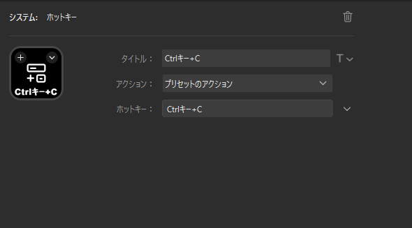 「アクション」という項目では、ドラッグ&ドロップをして割り当てたあと、このみのアクションを選択すればそれがワンボタンで可能になります。カット(Ctrl+C)やペースト(Ctrl+V)などの操作から、「エクスプローラーを開く」や「タスクマネージャを開く」など豊富な項目があるので、そちらも好みにセットするといいです。