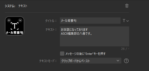 「テキスト」という項目も便利です。例えば、仕事で毎回必ずメールの文頭に書く「お世話になっております、○○(会社名)の○○(名前)です」といった文章を登録しておけば、メールを送りたいときにボタンを押せば、最初の文章がそのままペーストされます。時短という部分においては、結構役立ちます。