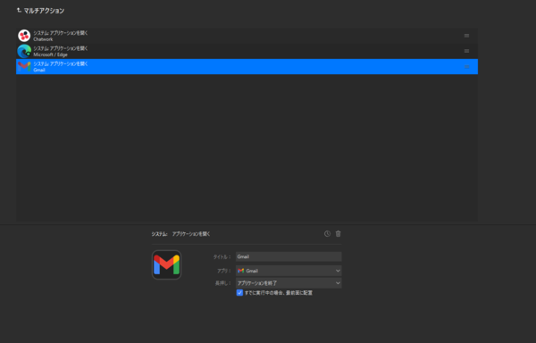 また、「マルチアクション」というのも便利で、複数のアクションを登録しておけば、ボタン1つで複数の操作を一気にやってくれます。例えば、Chatworkとテキストアプリ、ウェブサイトを立ち上げてから仕事を始めるといった場合に、この3つを登録しておけば、ボタンを押せば全部起動してくれます。