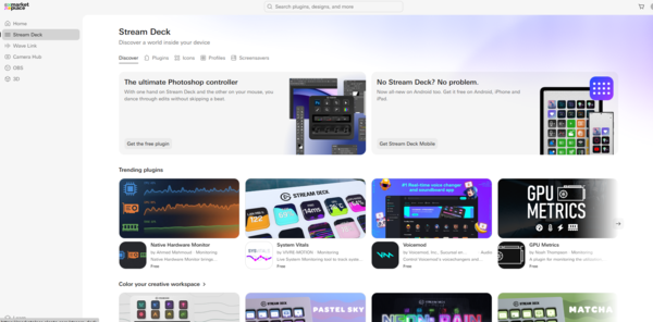 なお、Stream Deckでは、すでに色々な作業に特化したプラグインを、ウェブサイト上からダウンロードすることも可能です。例えば、OBS Studioの便利な機能をまとめたプラグインを入れれば、自分で設定することなくそのプラグインをインストールして、その項目の中から使いたいものをドラッグ&ドロップするだけでOK。もしウェブ上でいい設定があったら、ダウンロードするのもありです。