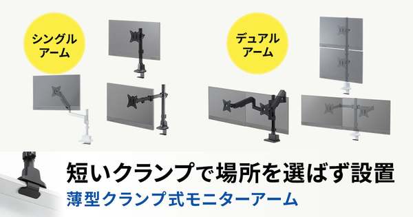 サンワサプライは2月下旬、薄型ショートクランプを採用したモニターアームシリーズを発売する。価格は7,700円から41,800円。