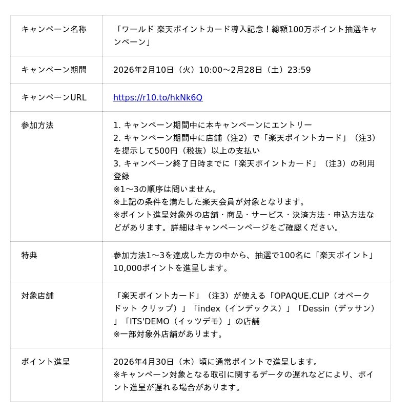株式会社ワールド(以下「ワールド」)と楽天ペイメント株式会社(以下「楽天ペイメント」)は、ワールドグループが展開する「OPAQUE.CLIP(オペーク ドット クリップ)」「index(インデックス)」「Dessin(デッサン)」「ITS'DEMO(イッツデモ)」の185店舗(注1)において、本日より共通ポイントサービス「楽天ポイントカード」が利用可能になることをお知らせします。なお、導入ブランドは今後も拡大していく予定です。