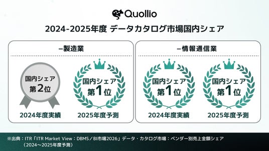 日本のエンタープライズ企業向けに次世代データインテリジェンスソリューションを提供する株式会社Quollio Technologies(本社:東京都港区、代表取締役社長 CEO:松元 亮太、以下「Quollio」)は、株式会社アイ・ティ・アール(本社:東京都新宿区、代表取締役:三浦元裕、以下「ITR」)が、2026年1月に発行した市場調査レポート「ITR Market View:DBMS/BI市場2026」において、国内データ・カタログ市場の業種別シェアで製造業および情報通信業で1位を獲得したことをお知らせします。また、市場全体でも2024年度実績および2025年度予測で2位を獲得しています。