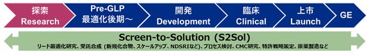 当社の創薬支援プラットフォーム「Screen‑to‑Solution(S2Sol)」の事業領域マップ。今回はこの中の「探索(Research)」領域に特化したAIスクリーニングサービスをご紹介します。