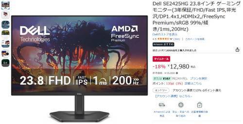 Dellの23.8インチゲーミングモニター「SE2425HG」が、Amazonのタイムセール対象になっています。参考価格15,800円のところ、18%オフの12,980円で販売中。