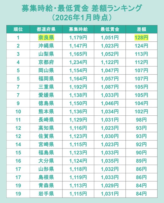 最後に2026年1月時点の募集時給が、新最低賃金に対してどのくらい上乗せされているかをランキングで分析します。対象自治体の中で最も差額が大きいのは奈良県で128円となり、次いで沖縄県が124円、山梨県が113円と続きました。