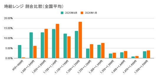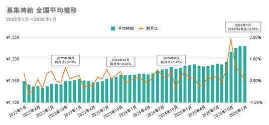 アルバイト系求人サイトにおける募集時給の全国平均を見ると、2025年9月の1,194円から2026年1月には1,230円へと上昇しました。