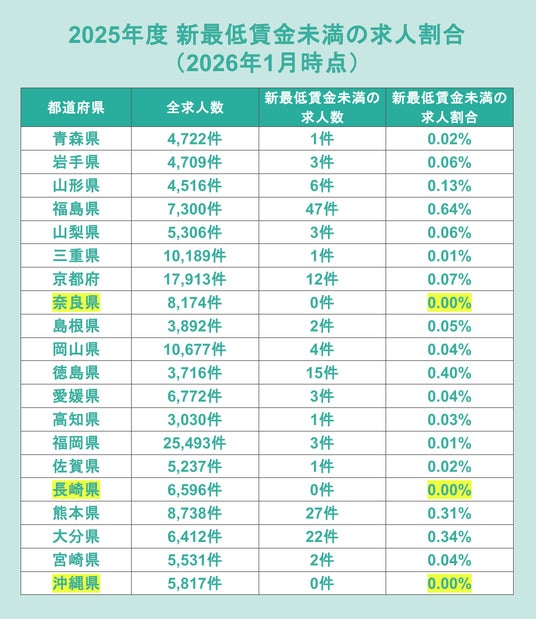 一方で、2026年1月1日に改定を行った熊本県、大分県、福島県、徳島県では相対的に最低賃金未満の求人割合が高く、改定直後の調整が続いている様子もうかがえました。