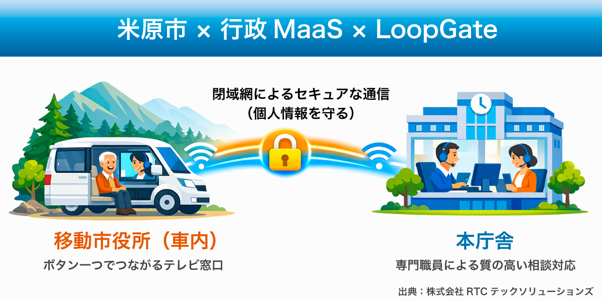 米原市は、人口減少と持続可能な窓口体制への移行における課題に対し、「移動市役所(行政MaaS)」を導入。車載テレビ窓口システムとしてLoopGateを活用し、庁舎への来庁を前提とせず、住民が身近な場所で専門的な相談や申請支援を受けられる「行かない市役所」を実運用しています。
