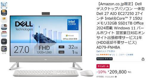 Dellの27インチ一体型デスクトップPC「Dell 27 AIO EC27250」が、Amazonのタイムセール対象になっています。参考価格232,800円のところ、10%オフの209,800円で販売中です。