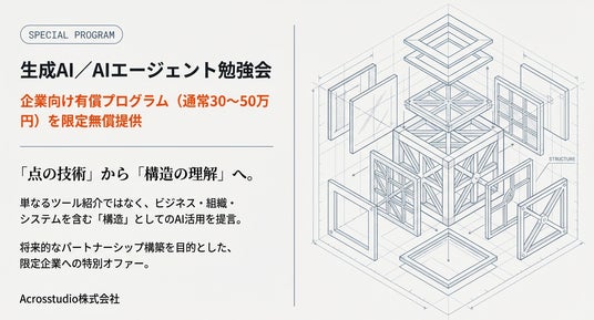 Acrosstudio株式会社(本社:東京都渋谷区、代表取締役:保知 一也)は、企業内でAI活用を検討・推進する部門を対象とした「生成AI/AIエージェント勉強会」を、特別条件にて無償提供する取り組みを開始いたしました。本勉強会は、通常30万円~で、提供している企業向け有償プログラムを、将来的なパートナーシップ構築を目的として限定企業に無償で提供するものです。