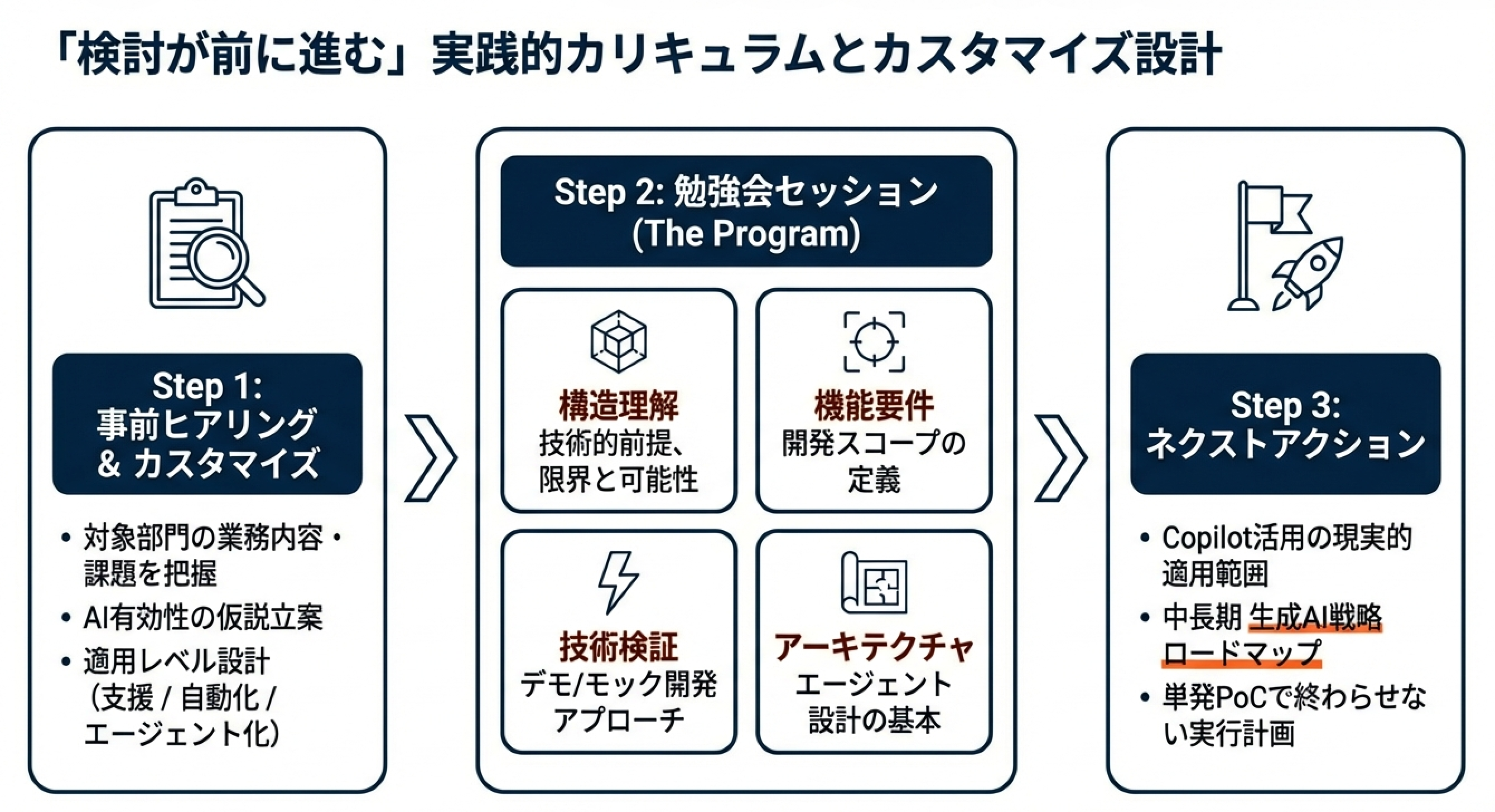 当社はこれまで数百社との接点を通じて、多様な業種・業態におけるAI活用の相談を受けてきました。その知見を踏まえ、今後本格的にAI活用を推進される企業の中から数社を対象に、ニーズや背景を丁寧にヒアリングした上で、限定的に本プログラムを実施いたします。