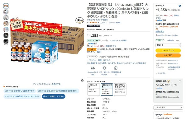 Amazon.co.jpにて、「【指定医薬部外品】【Amazon.co.jp限定】大正製薬 リポビタンD 100ml×30本」が販売中だ。価格は4358円。