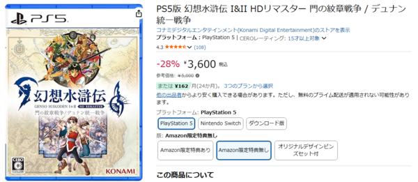 私が今回オススメしたいゲームタイトルは、「幻想水滸伝 I&II HDリマスター」です。パッケージ版の参考価格は5,000円ですが、今なら28%オフの3,600円でAmazonから購入できます。