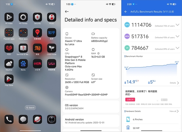 Xiaomi 17 Ultra by Leicaは6.9型(2608×1200、3500ニト)のLTPO AMOLEDディスプレーを搭載している。Xiaomi 15 Ultraよりサイズが大きくなったが解像度は抑えられている。フロントカメラは5000万画素で、Xiaomi 15 Ultraの3200万画素より高解像度となった。ホーム画面を見るとアイコンは専用のもので、ライカ風というかややアナログ感を出したデザインだ。