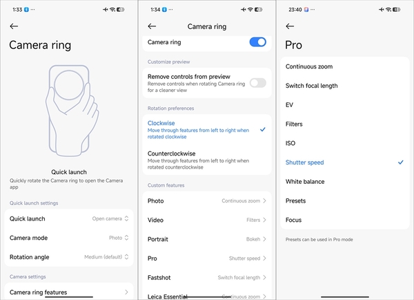 リングはいろいろな設定ができる。まずリングを軽く回すだけでスクリーンオフの状態からでもカメラのクイック起動や写真撮影が可能。カメラ起動中はリングの回転によりズーム倍率の変更、EV値変更、フィルター変更などができる。そして、カメラの各モードごとにリングの回転設定が可能だ。たとえば静止画の場合はズーミング、動画はEV、プロモードではホワイトバランスのように、個別の設定ができる。なお、プロモード以外では設定できる項目は少なくなる。