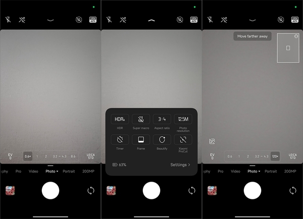 カメラアプリのUIはこれまでのシャオミ製品と同等だ。右上にある「LEICA AUTH(Leica Authentic)」と「LEICA VIBR(Leica Vibrant)」のカラーモード切り替えアイコンのサイズが若干大きくなったように感じられた。画面上部から下部にスワイプでクイック設定、そこから設定画面に入るUIはこれまでのモデルと同等だ。なお、最大120倍での撮影にも対応する。