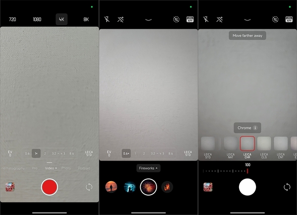 動画は4K 120fps、8K 30fpsにまで対応する。静止画(Photo)と動画(Video)モードでは、モード名をタップすることで特殊シーンの撮影モードとなり、シルエット、ステージ、花火、炎の各モードで撮影できる。また、各撮影モードでは右下の「LEICA STD」部分をタップすることで、ライカカラーのプリセットを複数から選択可能だ。