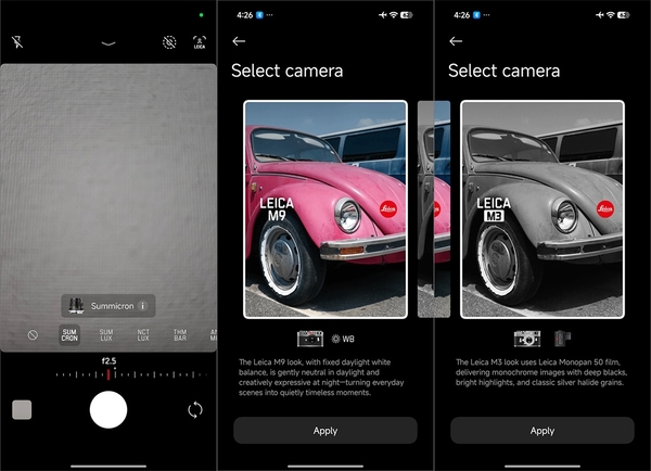 Xiaomi 17 Ultra by LeicaのカメラはXiaomi 17 Ultraにはないカメラリングを搭載しているほか、ライカのM3とM9をシミュレートするモードも搭載するなど、カメラ性能はより高められている。まずカメラリングは左右どちらにも回転可能だ。リングを回すと、本来は物理的なクリック機構がないにもかかわらず、本体のバイブレーションが回転に同期して細かく震え、まるでクリックで段階的に止まるリングを操作しているかのような感触を生む。
