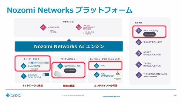 ソリューションとしては、パッシブ/アクティブなスキャンでOT資産を可視化するネットワークセンサー「Guardian」、無線LANを悪用する脅威を防ぐワイヤレスセンサー「Guardian AIR」、エンドポイントプロテクションセンサー「Arc」を提供し、そこに管理オプションや拡張機能が加わる。